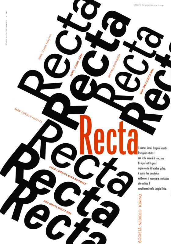 I chose it because I think it’s beautiful, and it’s never been fully digitized. You can definitely see that Recta, it’s Italian-the round and curves are really very specific. It was created after Univers came out, around the same time in the late 50s–early 60s when every [European] country wanted its own font like that. Recta was like that for Italy.